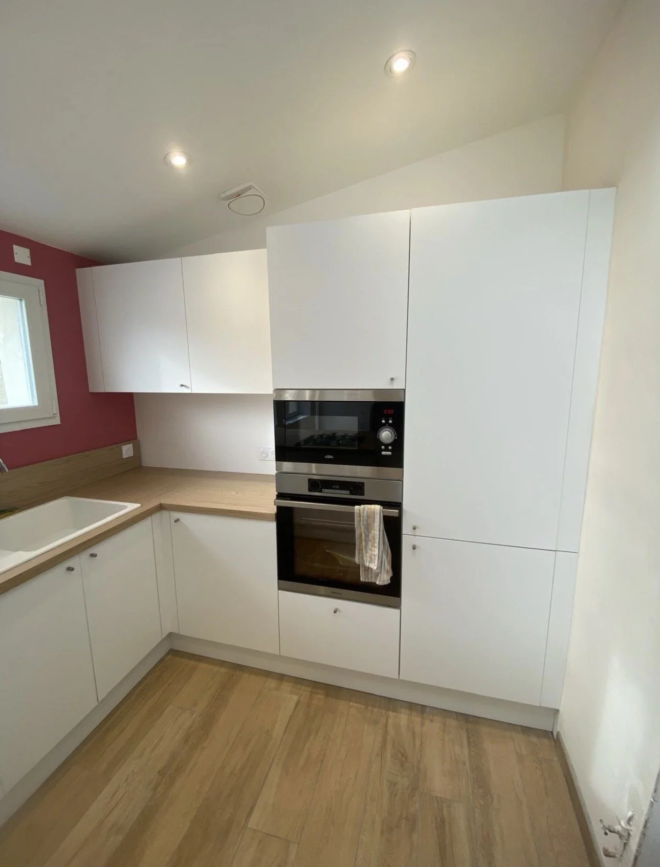 Les façades blanc mat créent un rendu lumineux et intemporel, tandis que le plan de travail bois naturel apporte chaleur et équilibre à l’ensemble. Cette combinaison offre un univers doux, contemporain et agréable à vivre au quotidien.