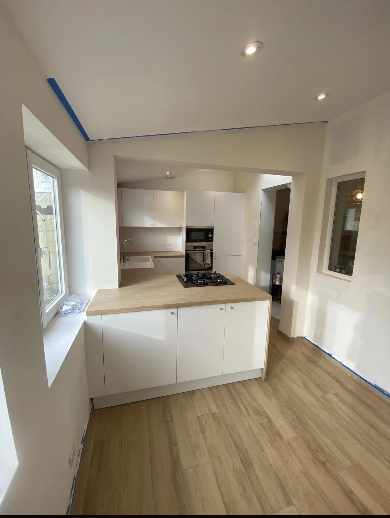 Les façades blanches apportent luminosité et sobriété, tandis que le plan de travail effet bois vient réchauffer l’ensemble et créer un équilibre naturel.