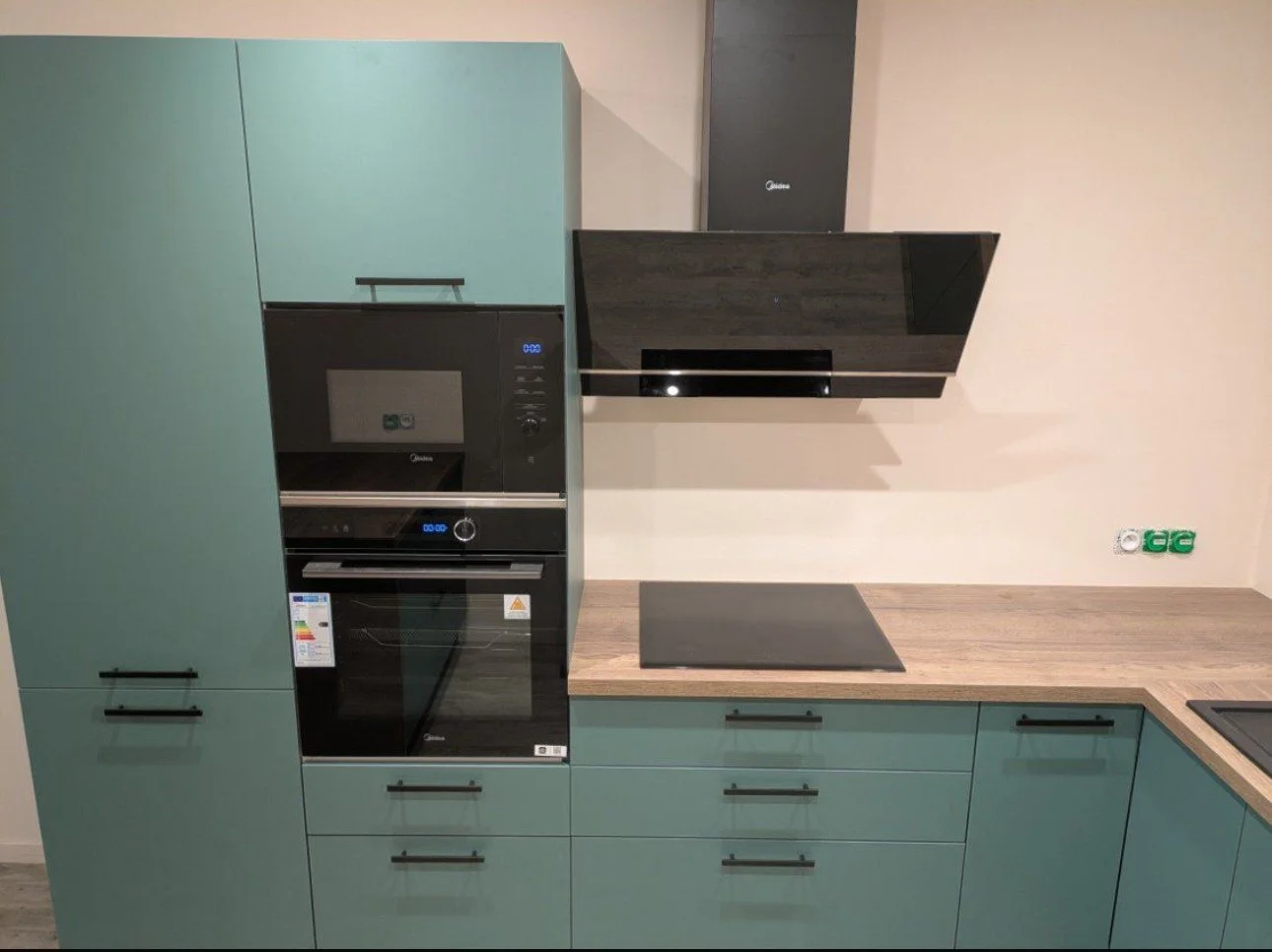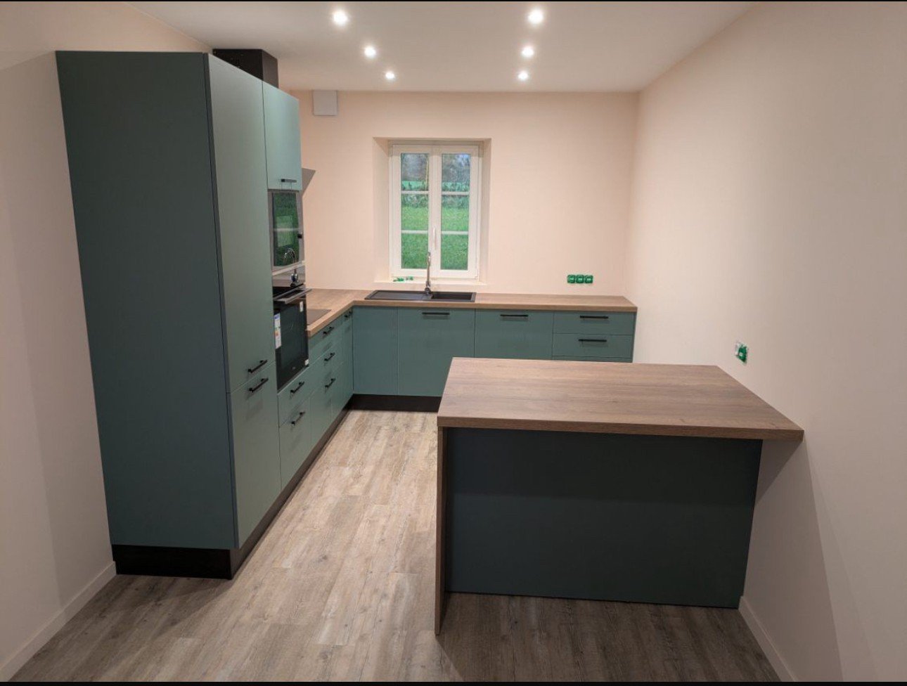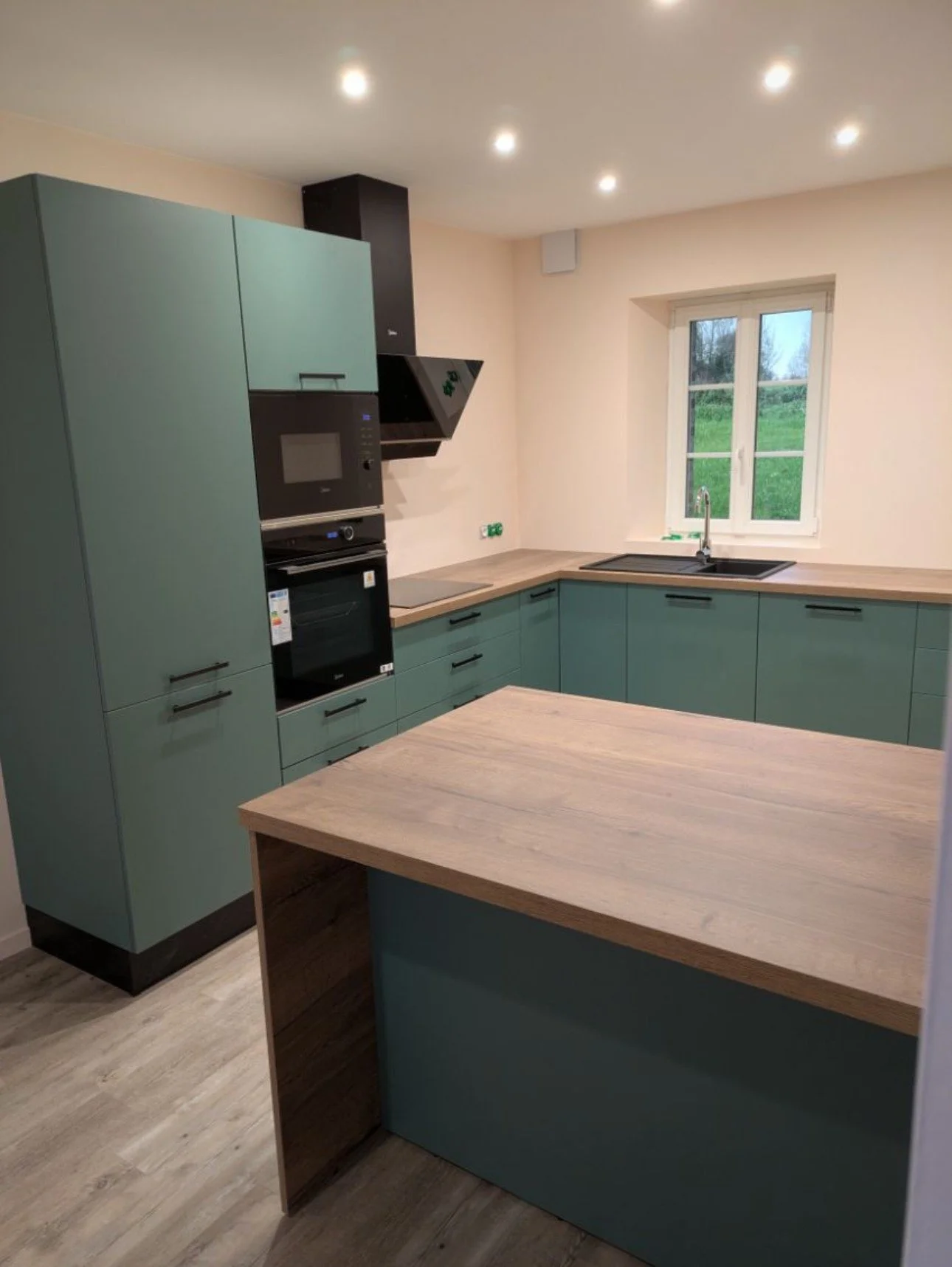 Les façades vert sauge apportent une atmosphère douce et contemporaine, tandis que le plan de travail en bois réchauffe l’ensemble et crée un équilibre naturel très agréable à vivre.