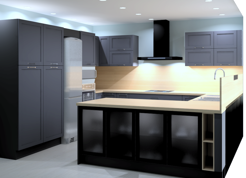 Ici, le modèle GIGLIO en finition PET opaque noir, cadre vitré fumé, façades gris cendré et plan de travail rovere nordico illustre parfaitement notre engagement vers la qualité et l’esthétique.