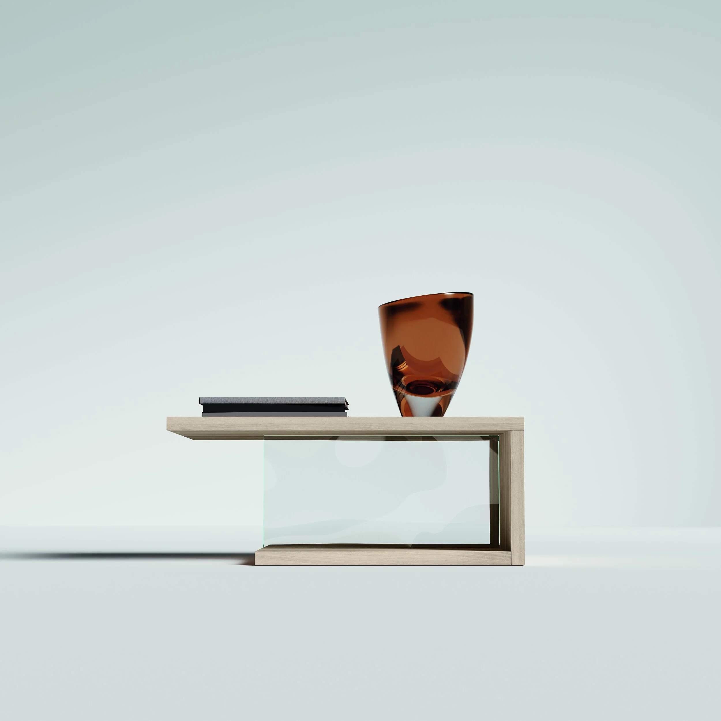 Table basse SIDE : Un design unique, polyvalent et élégant qui se distingue par une structure composée de deux plateaux en bois, reliés par une cloison de séparation en verre. Elle est idéale pour s’intégrer dans un espace raffiné tout en conservant des attributs forts de fonctionnalité.